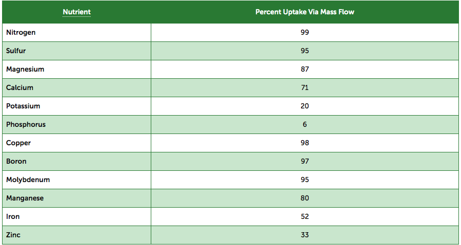 Table 1 – Macro- and micronutrients arranged by percent of plant uptake occurring by mass flow. The higher the percent uptake by the mass flow pathway, the higher the risk that drought will impact nutrient availability to the crop (Barber, 1984).
