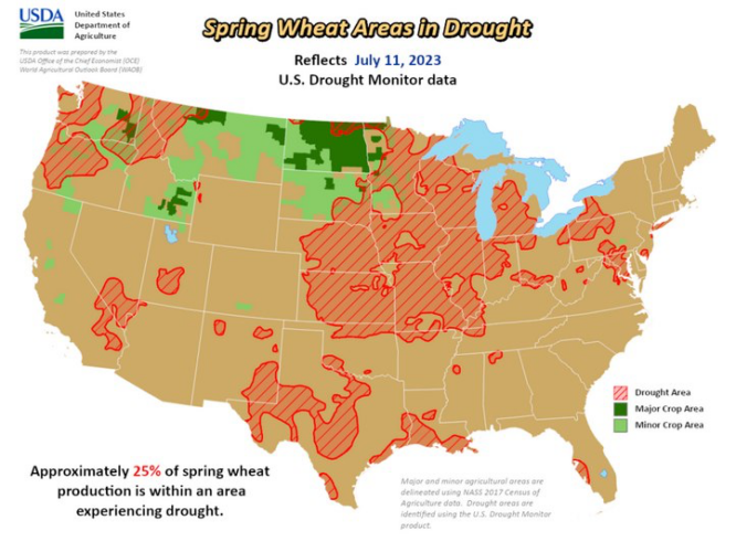 Figure 2 – USDA figures that overlay acres under drought and the major corn, soybean and spring wheat production areas of the United States for July 11, 2023 (Source: USDA).